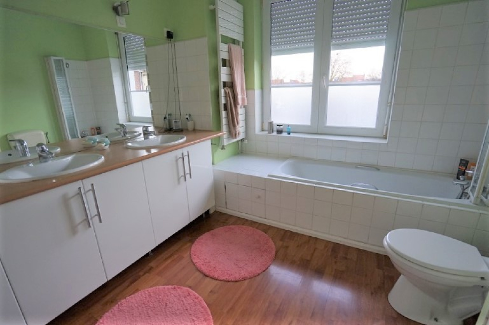 MAISON T4 SECTEUR LILLE BUISSON - Très jolie maison 1920 pleine de charme aux prestations de haute qualité d’environ 117 m² habitables – Jardinet en façade – Petite entrée avec mur de briques apparentes – Grande pièce de vie composée d’un agréable et lumineux salon ( 28m² ) avec parquet massif et d’une très grande cuisine équipée avec salle à manger en extension ( 30 m² ) – Wc suspendu avec lave-mains et espace buanderie - Baie vitrée donnant sur grande terrasse carrelée et mignon jardin avec cabanon – Au 1er étage belle chambre d’environ 16 m² avec petit espace vestiaire – Grande salle de bains ( 8,6 m²) avec baignoire, double vasque et wc – Au 2è étage une chambre ( 11.5 m² ) avec point d’eau et placard/ dressing et une chambre ( 11.8 m² ) – Au 3è étage combles très bien aménagés en espace bureau ( 6 m² Carrez, 16,4 m² au sol ) avec nombreux rangements sous pentes –Cave très saine – Chauffage gaz – Pièces du rez de chaussée entièrement refaites il y a 3 ans – Double vitrage partout ( refait à l’identique ) – Persiennes électriques en bas et manuelles aux étages ( sauf une absente côté rue ) – Stationnement facile juste en face – Enormément de charme, état impeccable, luminosité et calme pour cette maison « Coup de cœur » proche tram Buisson et petits commerces – Un vrai petit bijou ! Prix de vente honoraires inclus charge acquéreur : 4% TTC ( prix 460 000 € hors honoraires ) www.estime-immo.com