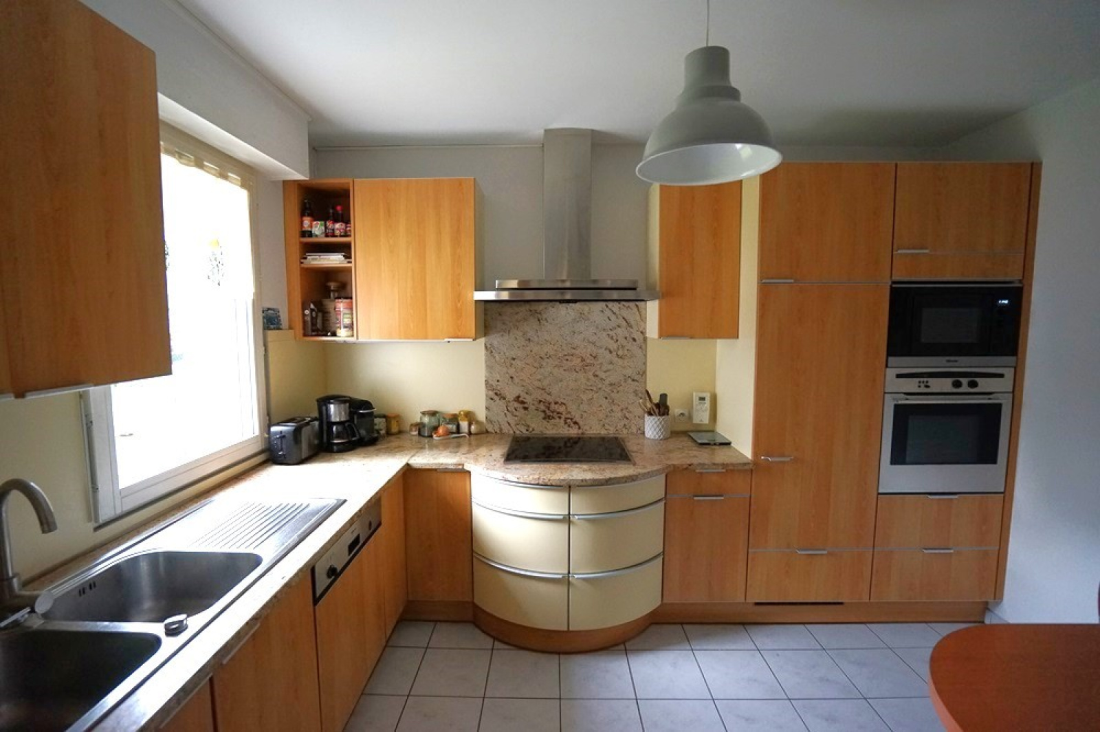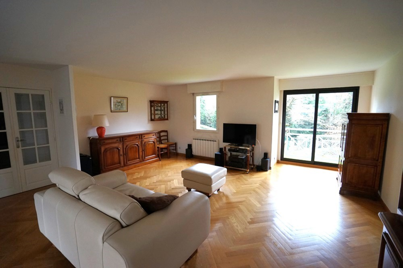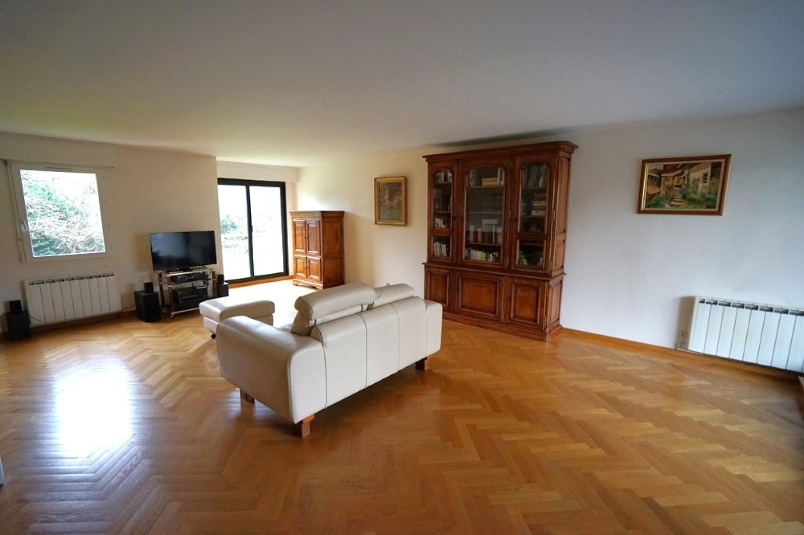 Spacieux hall d’entrée avec porte sécurisée et grand placard intégré. Lumineux séjour traversant de presque 50m² avec un joli parquet chevrons. Cuisine équipée séparée avec plan de travail en marbre et nombreux rangements. Cellier avec emplacement machine à laver. Wc séparés avec lave-mains.