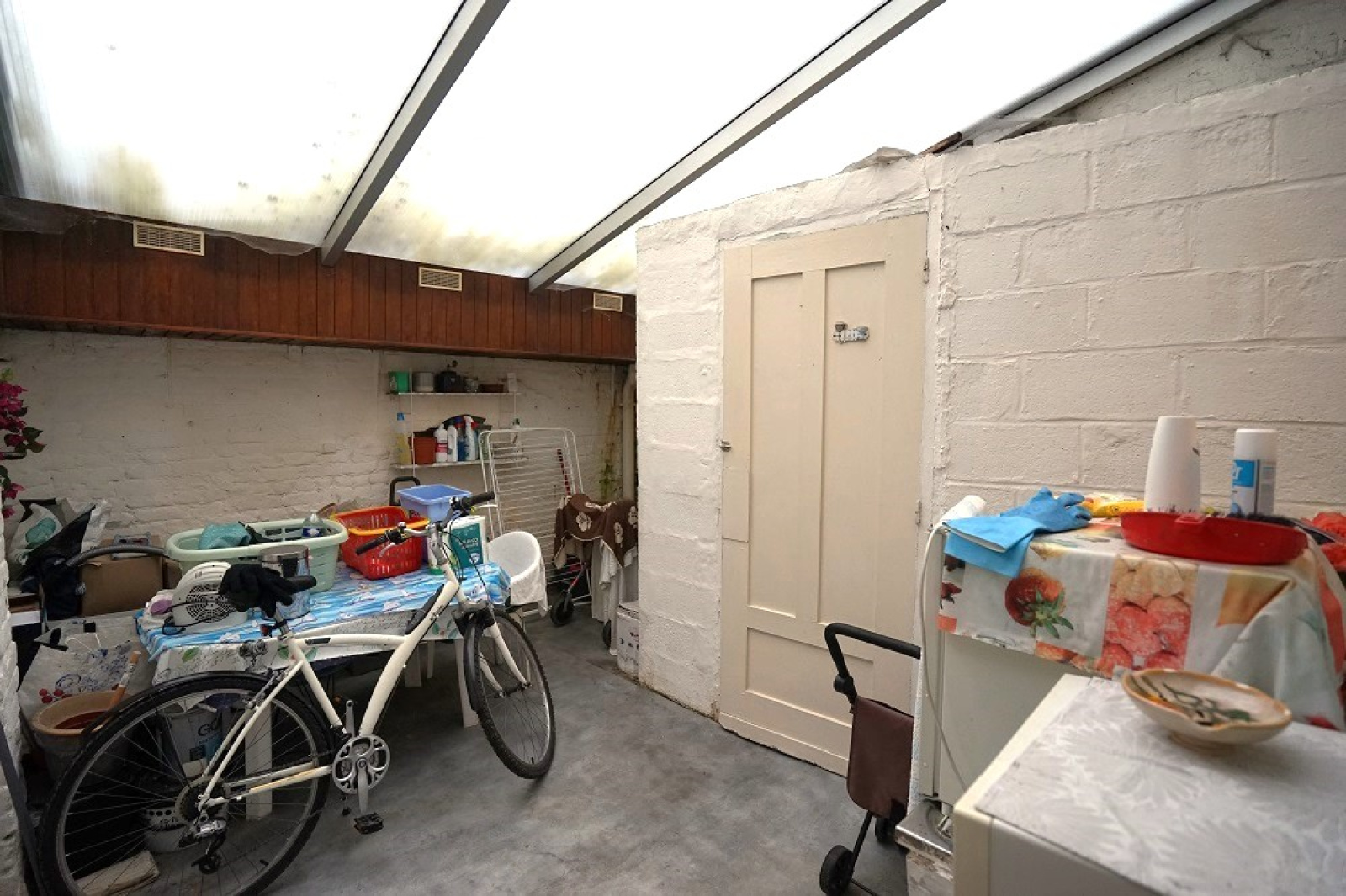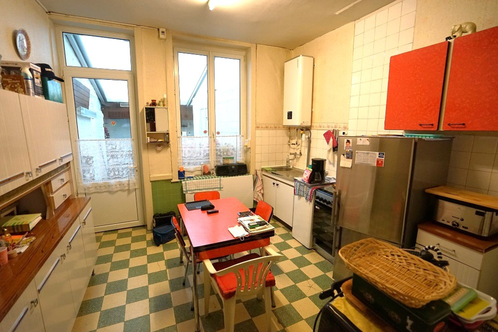 Au rez-de-chaussée, un couloir d’entrée, un salon et une cuisine séparée offre la possibilité d’une belle pièce de vie traversante. Une véranda permet éventuellement de retrouver un extérieur type cour. Salle de douche avec wc actuellement dans cette véranda.
