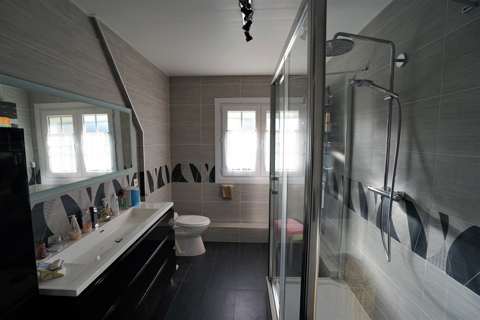Au 1er étage : couloir desservant 2 chambres avec placards intégrés – Salle de bains entièrement rénovée et carrelée (vasque, douche, sèche-serviettes et wc) – Bureau – Petite salle de douche intéressante car attenante à un grenier de 18m² tout à fait aménageable en grande suite parentale