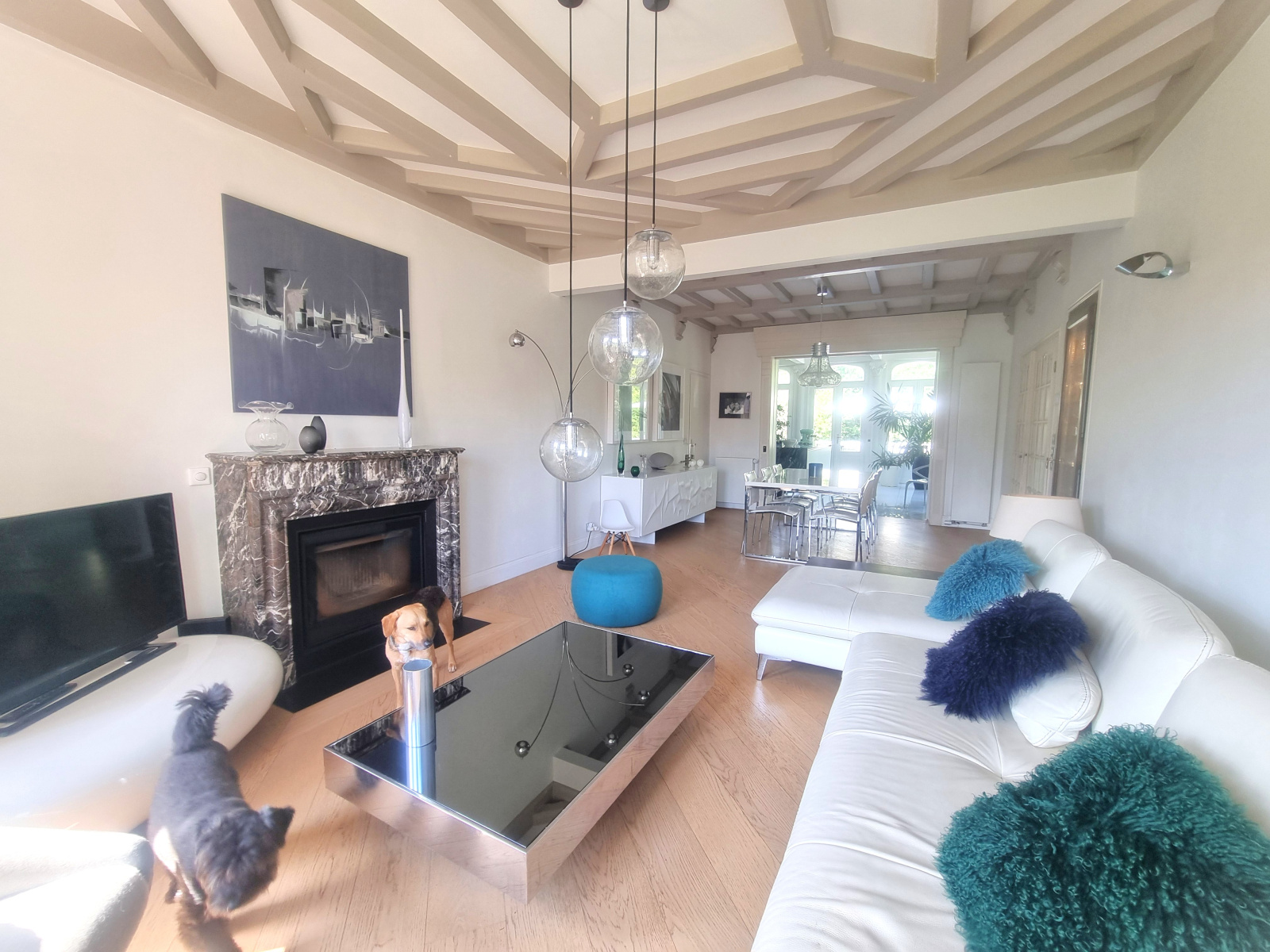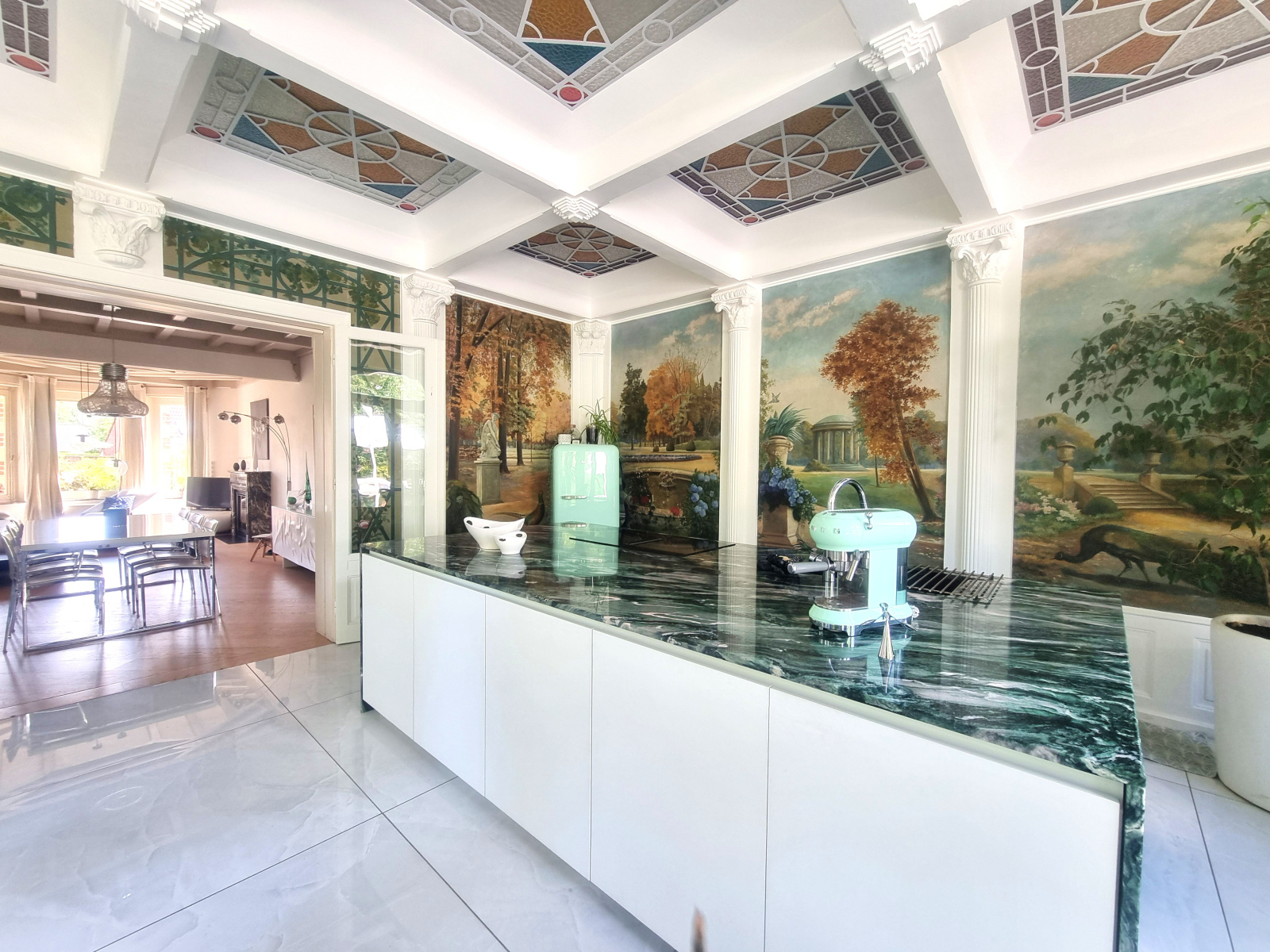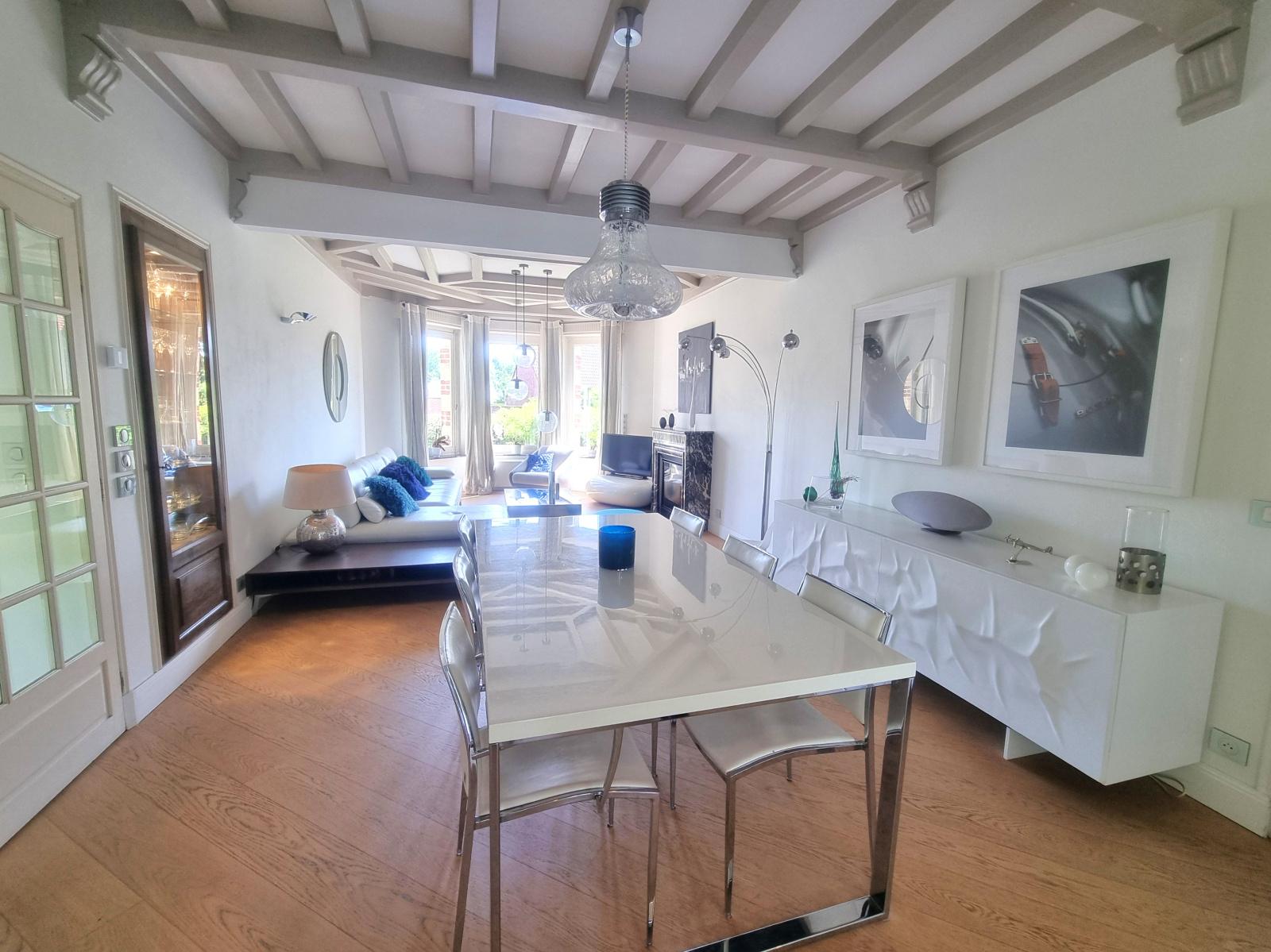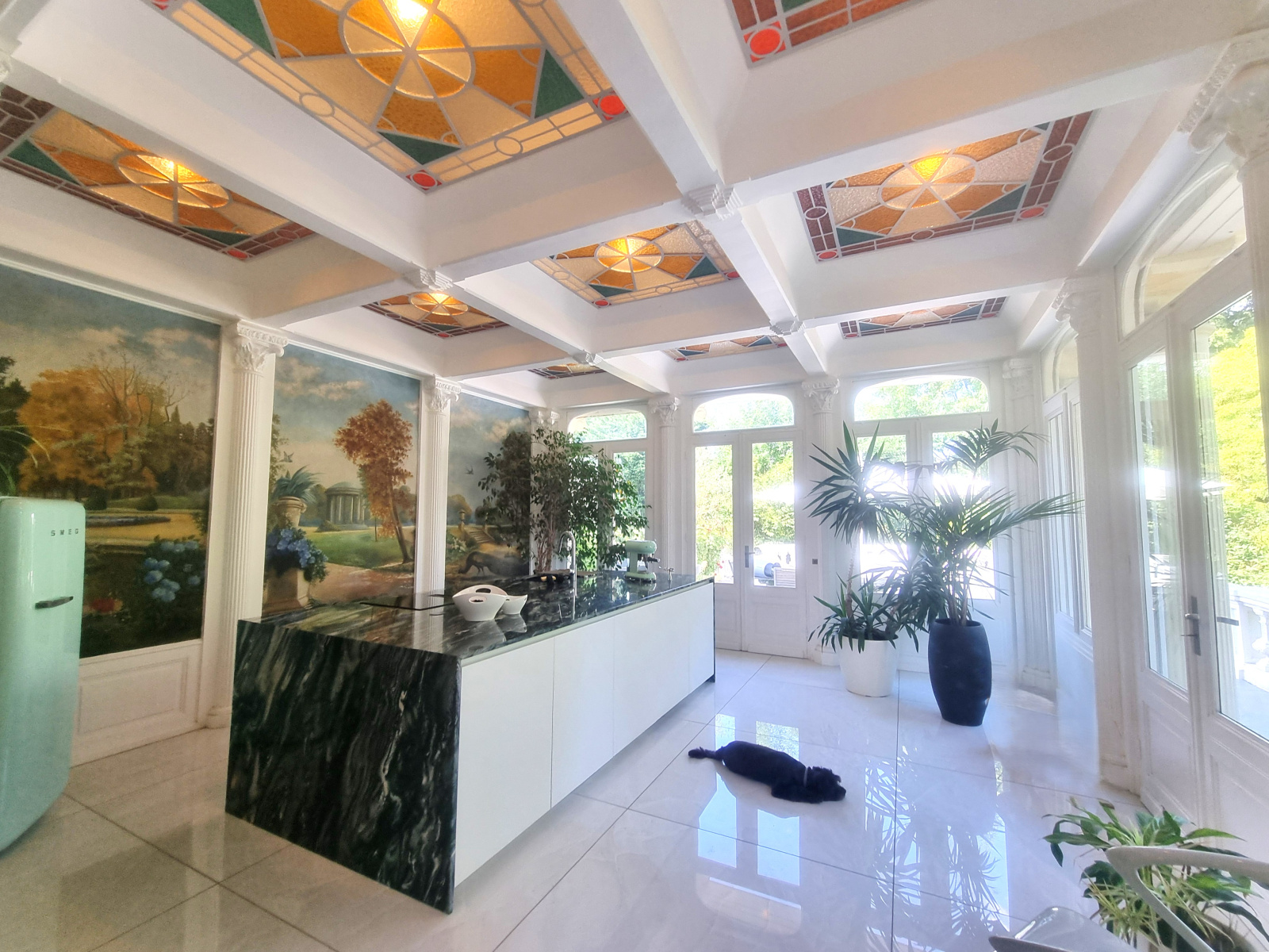 La pièce de vie spacieuse d'environ 65 m² vous charmera avec son bow-window, sa cheminée rénovée et son parquet élégant. Cet espace lumineux vous conduit vers une majestueuse cuisine qui vous fera voyager dans le temps, avec ses fresques murales et ses vitraux qui remplace le plafond que vous pouvez illuminer selon vos envies. L'îlot central en granit vert, rappel de la nature environnante, est parfait pour des moments de partage en famille ou entre amis, tout en offrant une vue imprenable sur le parc et la superbe terrasse.Au premier étage, vous découvrirez deux belles chambres d'environ 16 m², dont l'une dispose d'un balcon privatif. Ces chambres sont séparées par une salle de douche moderne, équipée d'un WC de type sanibroyeur. L'ensemble des fenêtres de la maison est en double vitrage, garantissant confort et isolation.